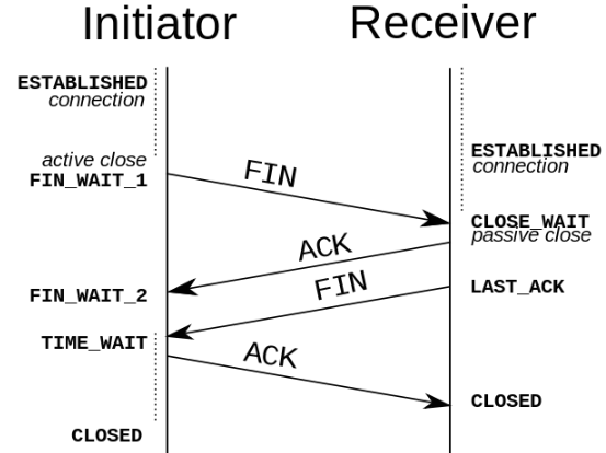 A 收到释放请求后,向 B 发送确认应答,此时 A 进入 TIME-WAIT 状态。该状态会持续 2MSL(最大段生存期,指报文段在网络中生存的时间,超时会被抛弃) 时间,若该时间段内没有 B 的重发请求的话,就进入 CLOSED 状态。当 B 收到确认应答后,也便进入 CLOSED 状态。
