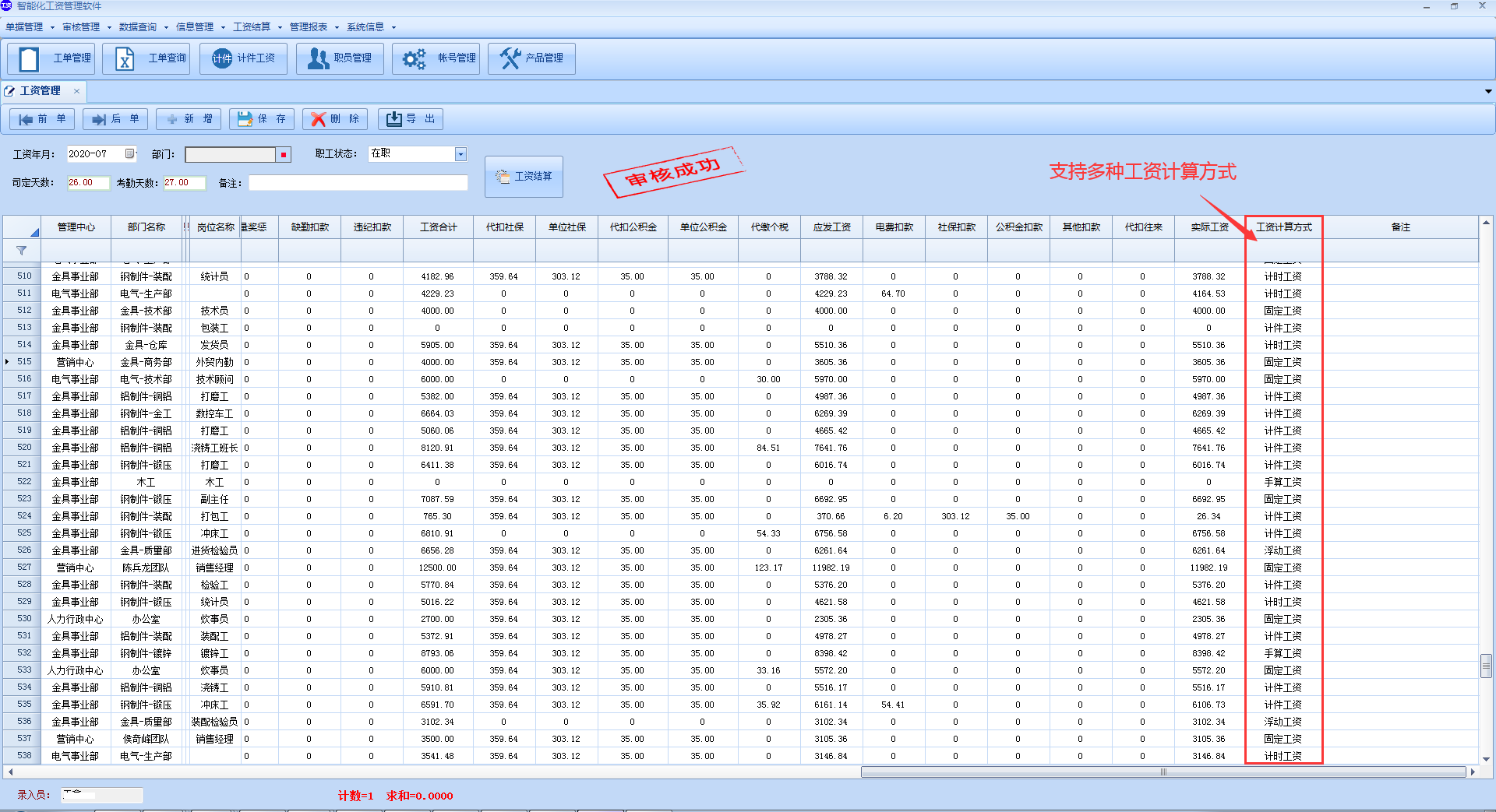 1. 支持多种工资计算方式(计件工资、计时工资、固定工资、浮动工资、手动工资等)